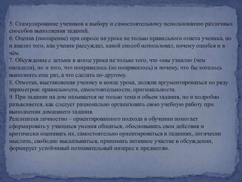 8. Отметка, выставляемая ученику в конце урока, должна аргументироваться по ряду параметров: правильности, самостоятельности, оригинальности.