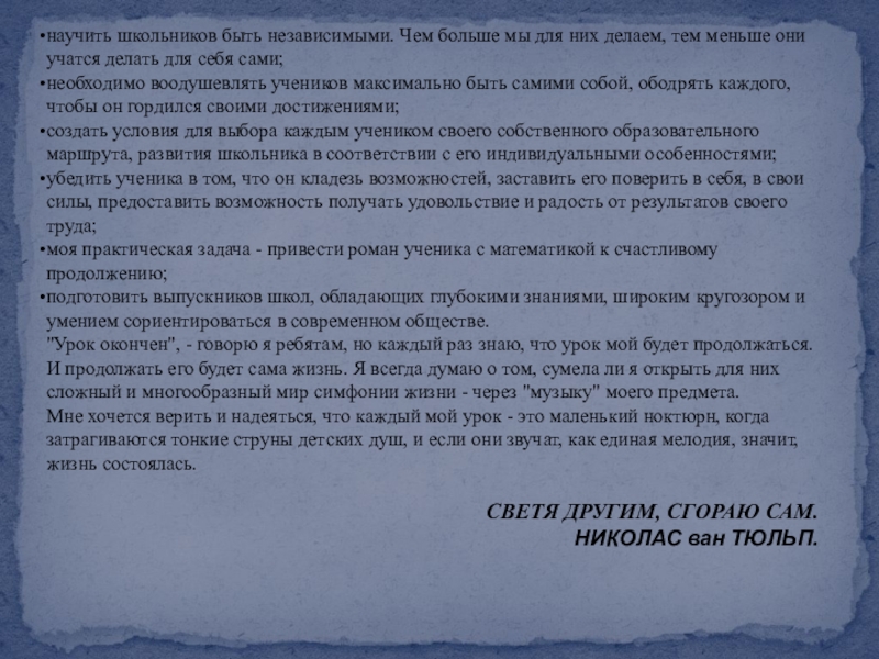 Мне хочется верить и надеяться, что каждый мой урок - это маленький ноктюрн, когда затрагиваются тонкие струны детских душ, и если они звучат, как единая мелодия, значит, жизнь состоялась.