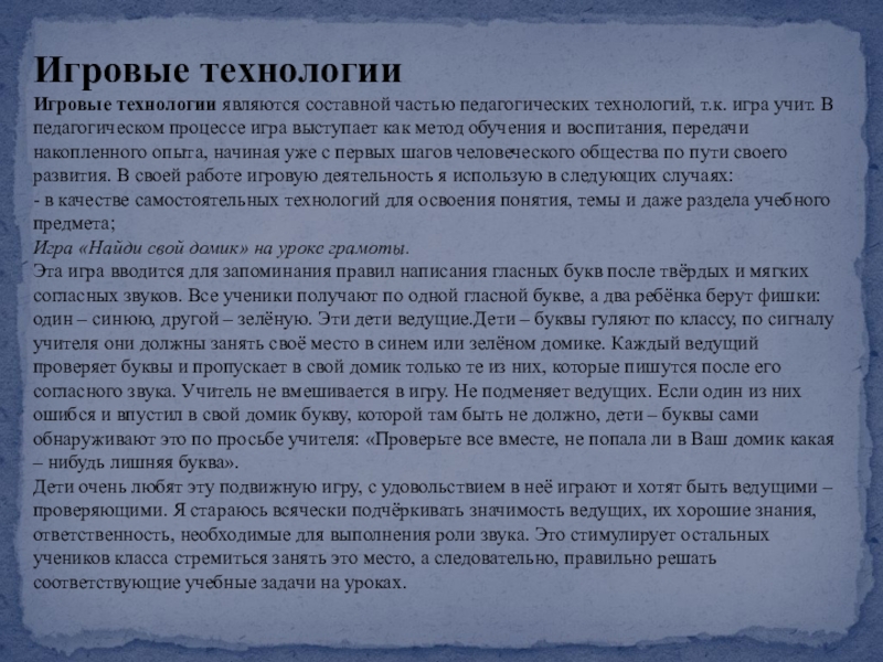 Игровые технологии являются составной частью педагогических технологий, т.к. игра учит. В