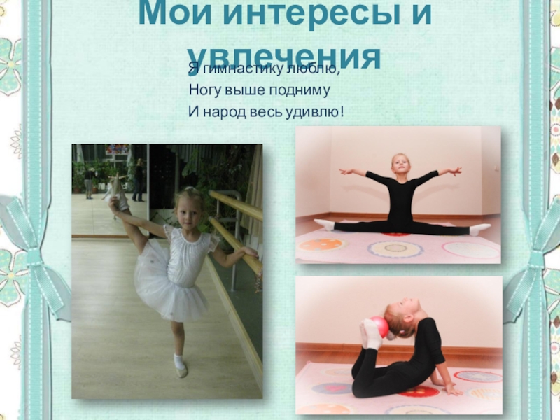 Мои интересы и увлеченияЯ гимнастику люблю, Ногу выше поднимуИ народ весь удивлю!