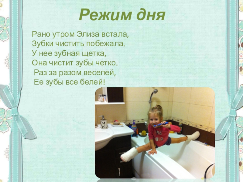 Режим дня Рано утром Элиза встала, Зубки чистить побежала. У нее зубная щетка, Она чистит зубы четко.