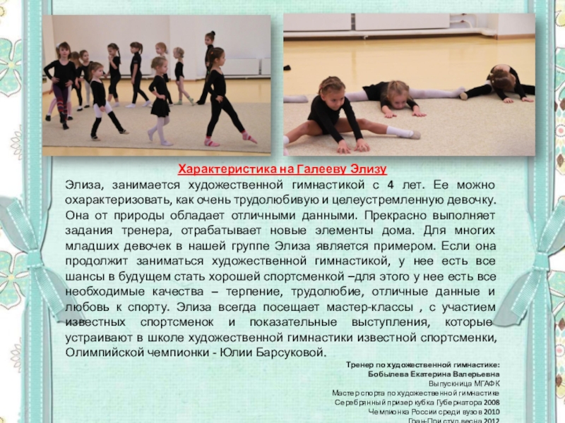 можно охарактеризовать, как очень трудолюбивую и целеустремленную девочку. Она от природы обладает отличными данными. Прекрасно выполняет задания тренера, отрабатывает новые элементы дома. Для многих младших девочек в нашей группе Элиза является примером. Если она продолжит заниматься художественной гимнастикой, у нее есть все шансы в будущем стать хорошей спортсменкой –для этого у нее есть все необходимые качества – терпение, трудолюбие, отличные данные и любовь к спорту. Элиза всегда посещает мастер-классы , с участием известных спортсменок и показательные выступления, которые устраивают в школе художественной гимнастики известной спортсменки, Олимпийской чемпионки - Юлии Барсуковой.