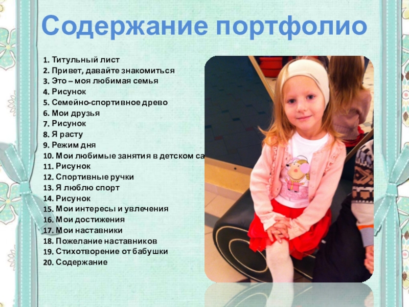 Содержание портфолио    1. Титульный лист    2. Привет, давайте знакомиться