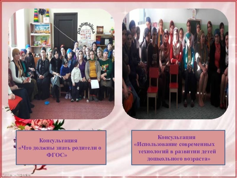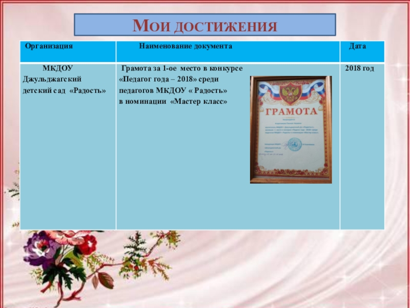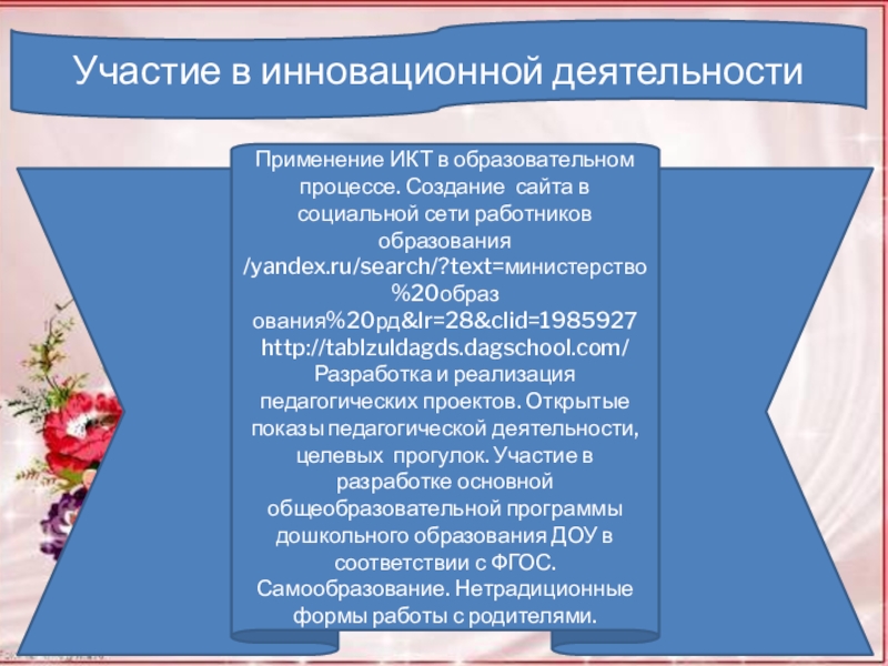 образования /yandex.ru/search/?text=министерство%20образ ования%20рд&lr=28&clid=1985927 http://tablzuldagds.dagschool.com/ Разработка и реализация педагогических проектов. Открытые показы педагогической деятельности, целевых прогулок. Участие в разработке основной общеобразовательной программы дошкольного образования ДОУ в соответствии с ФГОС. Самообразование. Нетрадиционные формы работы с родителями.
