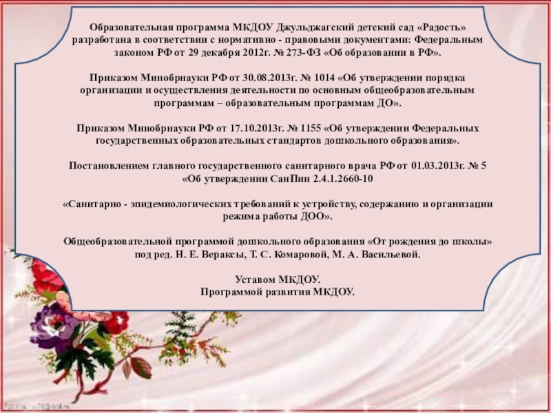 нормативно - правовыми документами: Федеральным законом РФ от 29 декабря 2012г. № 273-ФЗ «Об образовании в РФ».