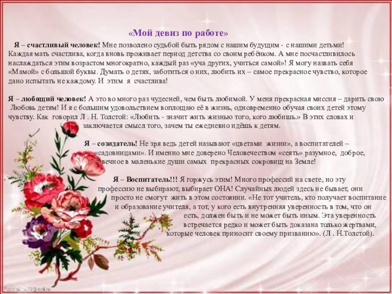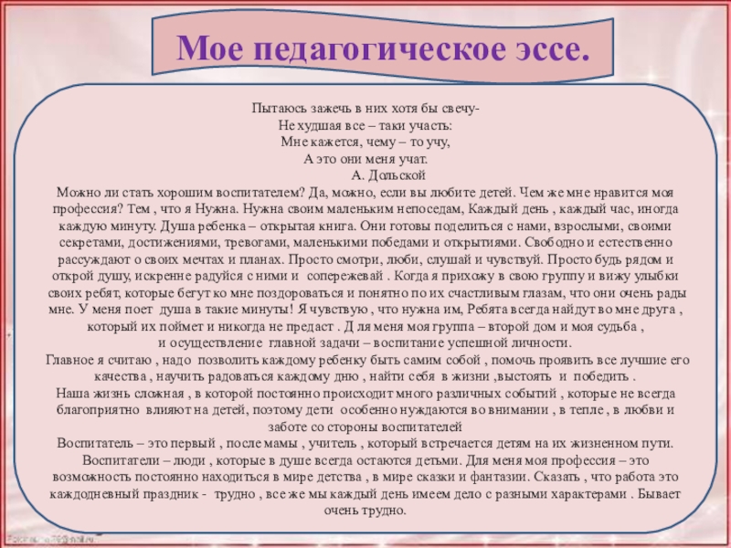 Воспитатель – это первый , после мамы , учитель , который встречается детям на их жизненном пути. Воспитатели – люди , которые в душе всегда остаются детьми. Для меня моя профессия – это возможность постоянно находиться в мире детства , в мире сказки и фантазии. Сказать , что работа это каждодневный праздник - трудно , все же мы каждый день имеем дело с разными характерами . Бывает очень трудно.