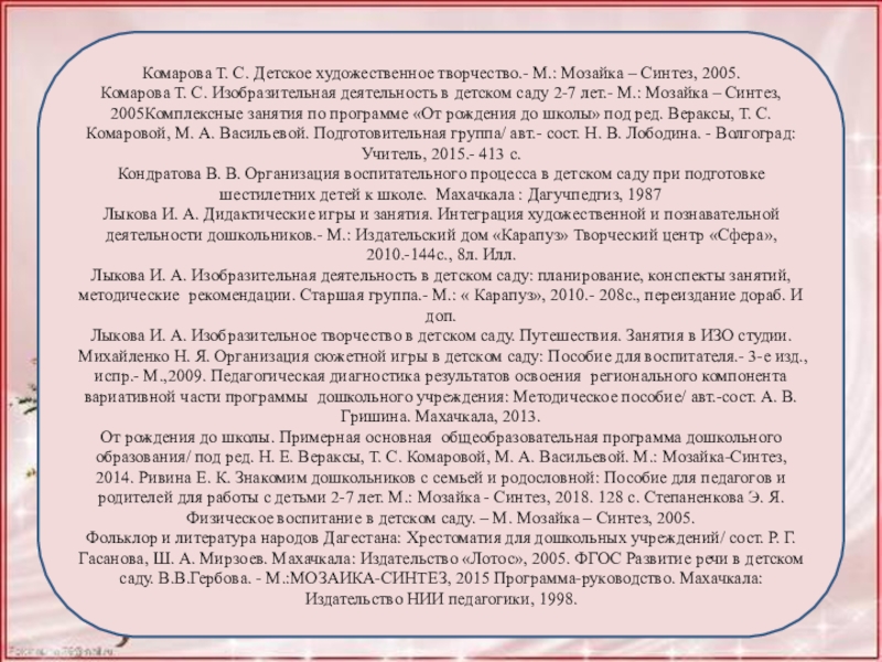 Слайд 35Комарова Т. С. Детское художественное творчество.- М.: Мозайка – Синтез, 2005.