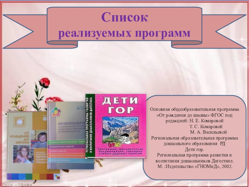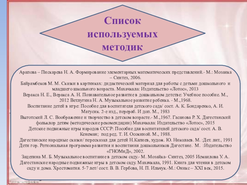 Фольклор и литература народов Дагестана: Хрестоматия для дошкольных учреждений/ сост. Р. Г. Гасанова, Ш. А. Мирзоев. Махачкала: Издательство «Лотос», 2005. ФГОС Развитие речи в детском саду. В.В.Гербова. - М.:МОЗАИКА-СИНТЕЗ, 2015 Программа-руководство. Махачкала: Издательство НИИ педагогики, 1998.