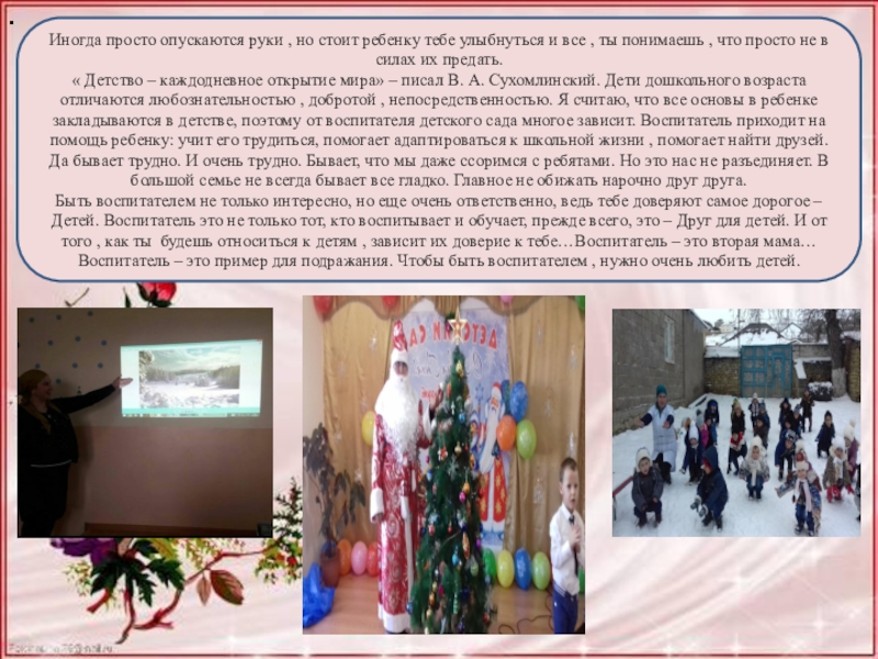 « Детство – каждодневное открытие мира» – писал В. А. Сухомлинский. Дети дошкольного возраста отличаются любознательностью , добротой , непосредственностью. Я считаю, что все основы в ребенке закладываются в детстве, поэтому от воспитателя детского сада многое зависит. Воспитатель приходит на помощь ребенку: учит его трудиться, помогает адаптироваться к школьной жизни , помогает найти друзей. Да бывает трудно. И очень трудно. Бывает, что мы даже ссоримся с ребятами. Но это нас не разъединяет. В большой семье не всегда бывает все гладко. Главное не обижать нарочно друг друга.