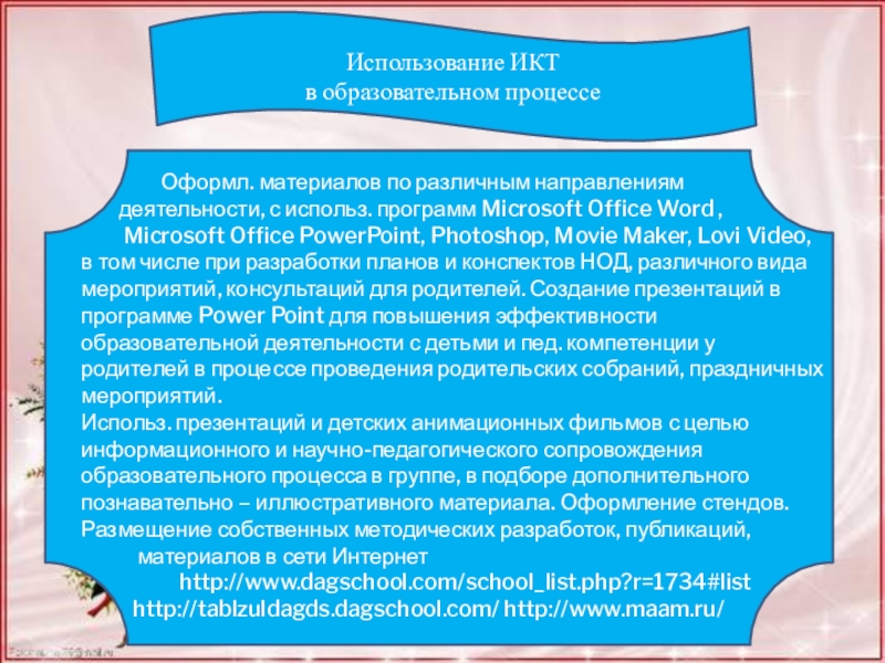 в том числе при разработки планов и конспектов НОД, различного вида мероприятий, консультаций для родителей. Создание презентаций в программе Power Point для повышения эффективности образовательной деятельности с детьми и пед. компетенции у родителей в процессе проведения родительских собраний, праздничных мероприятий.
