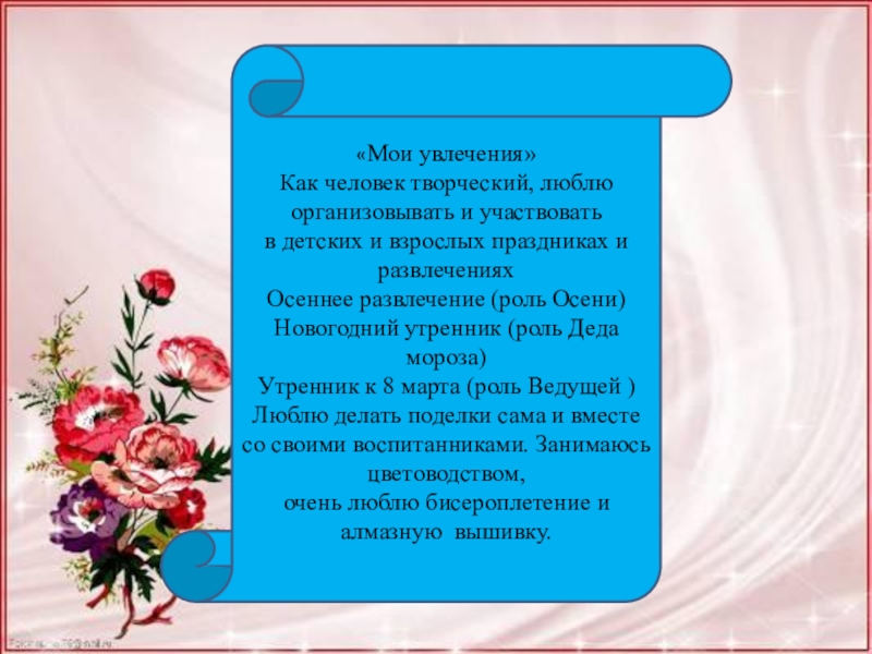 Люблю делать поделки сама и вместе со своими воспитанниками. Занимаюсь цветоводством,