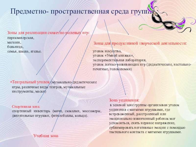 в зеленой зоне группы организован уголок уединения с мягкими игрушками, где встревоженный, расстроенный или эмоционально взвинченный ребенок мог успокоиться, снять нервное напряжение, сублимировать негативные эмоции с помощью тактильного контакта с мягкими игрушками.