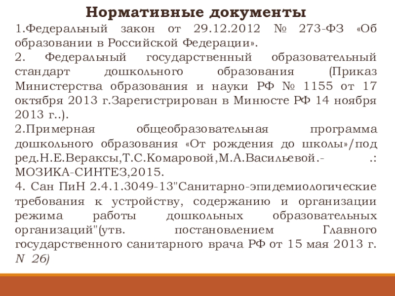 4. Сан ПиН 2.4.1.3049-13"Санитарно-эпидемиологические требования к устройству, содержанию и организации режима работы дошкольных образовательных организаций"(утв. постановлением Главного государственного санитарного врача РФ от 15 мая 2013 г. N 26)