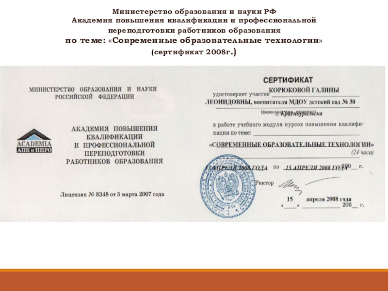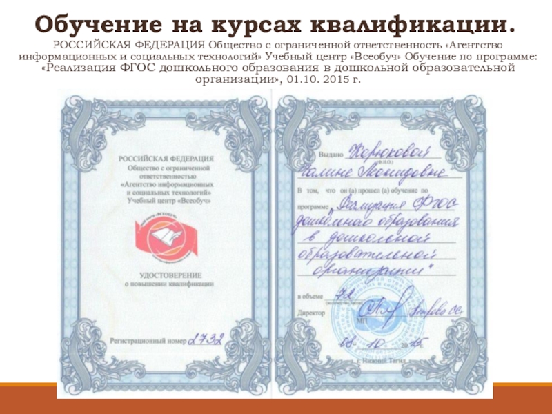 информационных и социальных технологий» Учебный центр «Всеобуч» Обучение по программе: «Реализация ФГОС дошкольного образования в дошкольной образовательной организации», 01.10. 2015 г.
