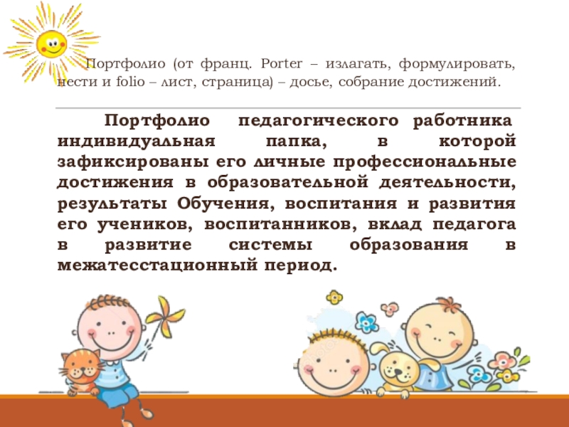 Портфолио педагогического работника индивидуальная папка, в которой зафиксированы его личные профессиональные достижения в образовательной деятельности, результаты Обучения, воспитания и развития его учеников, воспитанников, вклад педагога в развитие системы образования в межатесстационный период.