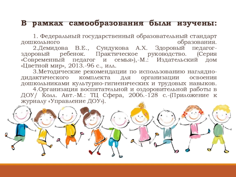 4.Организация воспитательной и оздоровительной работы в ДОУ/ Колл. Авт.-М.: ТЦ Сфера, 2006.-128 с.-(Приложение к журналу «Управление ДОУ»).
