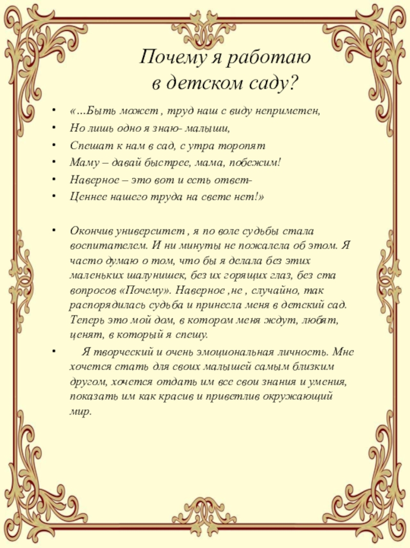 Окончив университет , я по воле судьбы стала воспитателем. И ни минуты не пожалела об этом. Я часто думаю о том, что бы я делала без этих маленьких шалунишек, без их горящих глаз, без ста вопросов «Почему». Наверное ,не , случайно, так распорядилась судьба и принесла меня в детский сад. Теперь это мой дом, в котором меня ждут, любят, ценят, в который я спешу.