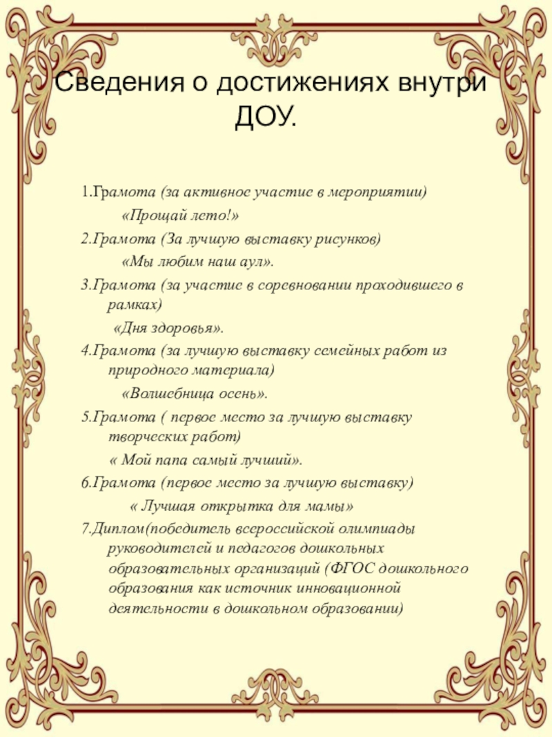 Слайд 10Сведения о достижениях внутри ДОУ.