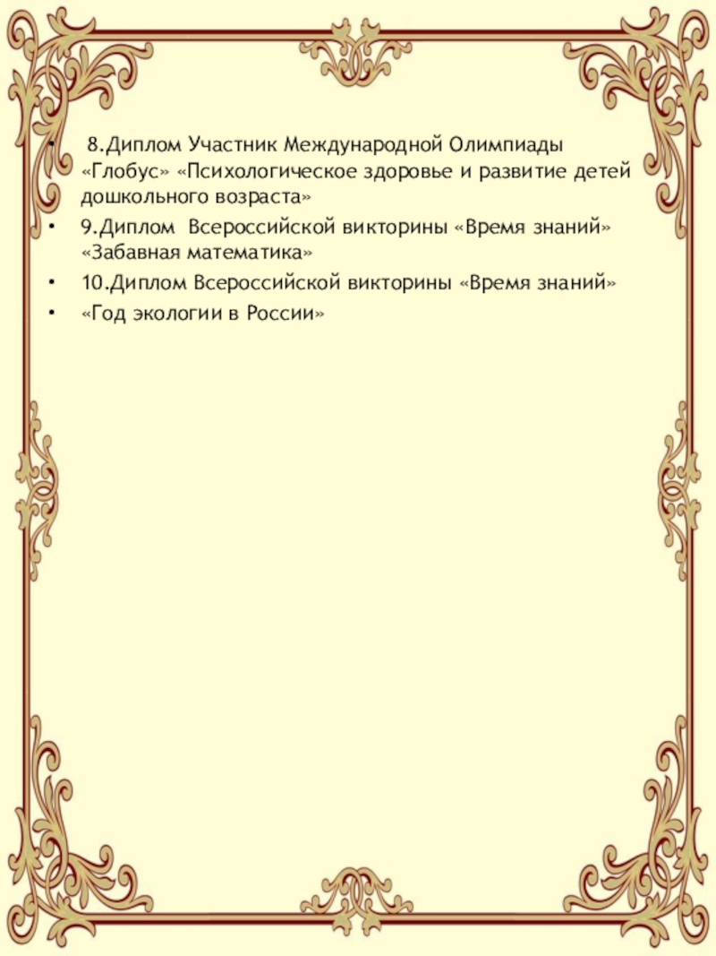 Слайд 11 8.Диплом Участник Международной Олимпиады «Глобус» «Психологическое здоровье и развитие детей