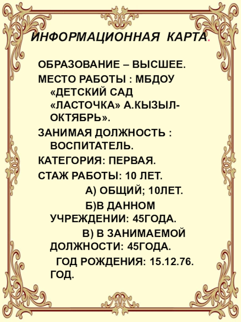 Место работы : МБДОУ «ДЕТСКИЙ САД «ЛАСТОЧКА» А.КЫЗЫЛ-ОКТЯБРЬ».