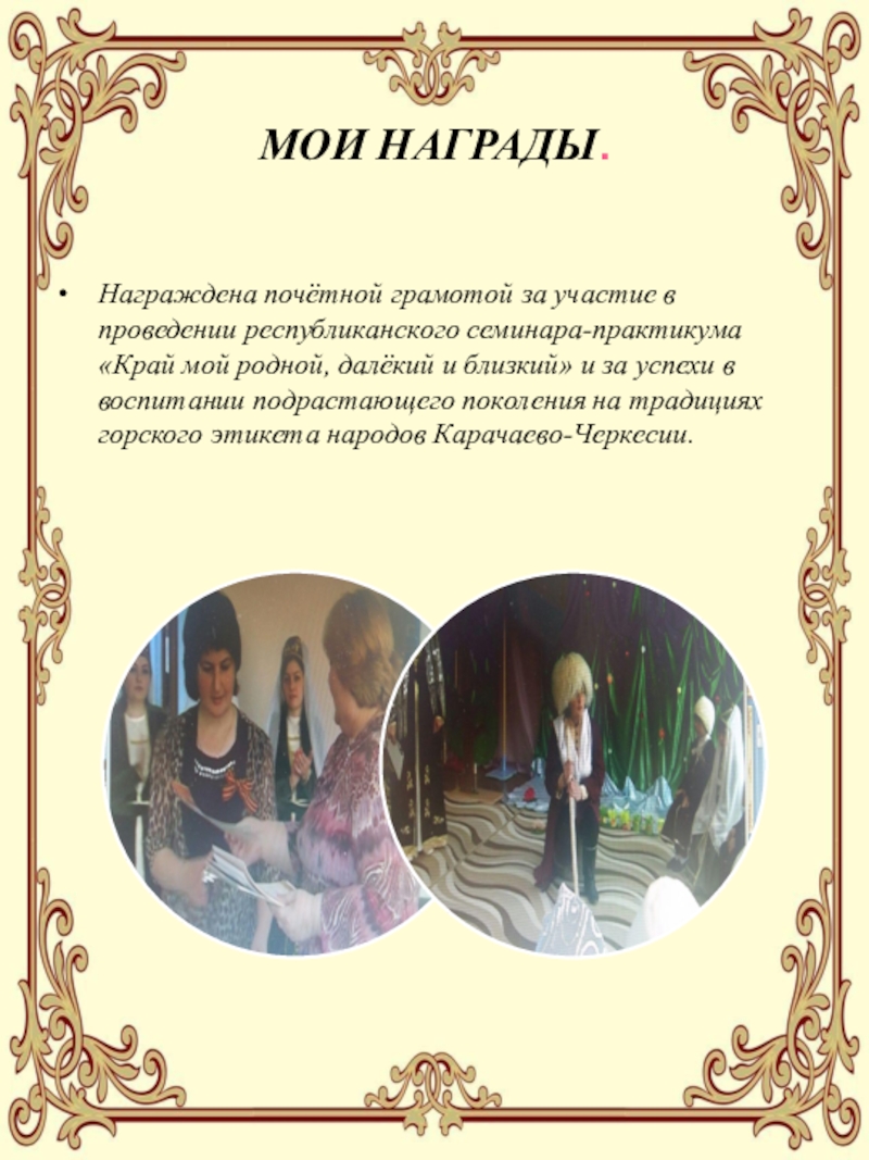 мой родной, далёкий и близкий» и за успехи в воспитании подрастающего поколения на традициях горского этикета народов Карачаево-Черкесии.