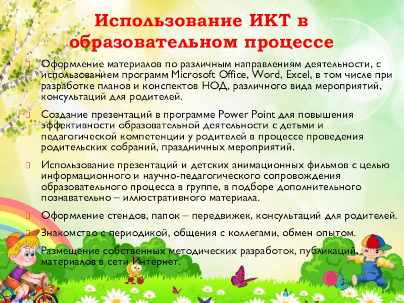 использованием программ Microsoft Office, Word, Excel, в том числе при разработке планов и конспектов НОД, различного вида мероприятий, консультаций для родителей.