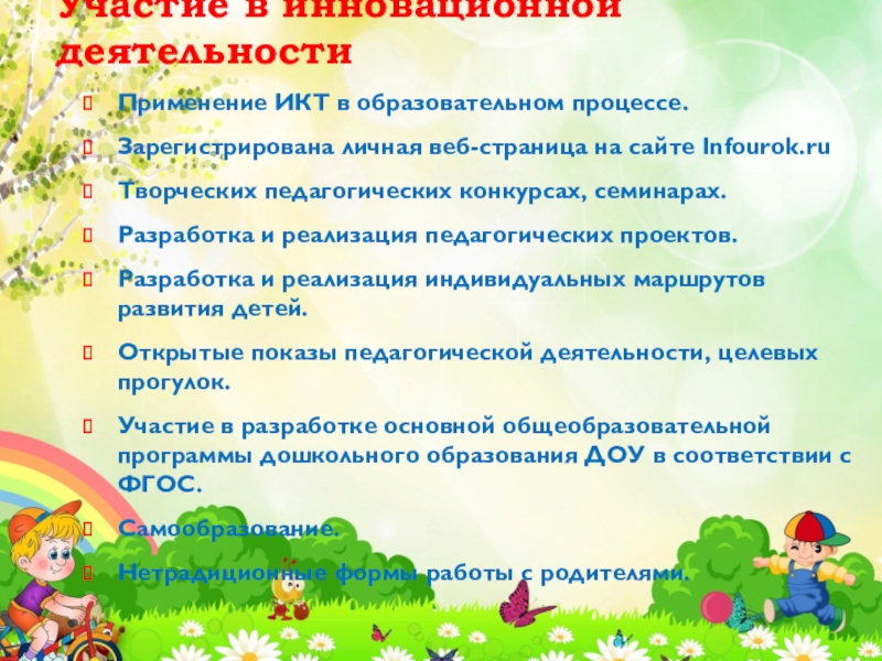 Мои принципы работы: предоставлять детям больше самостоятельности и право выбора, уметь вставать на позицию ребенка, видеть в нем личность, индивидуальность, помогать ему быть социально значимым и успешным. Всегда нужно верить в возможности каждого ребенка. Я учу детей доброте, развиваю в них творческие способности. Воспитываю любовь и уважение к родному дому, друзьям, родителям, детскому саду, к своей малой Родине.