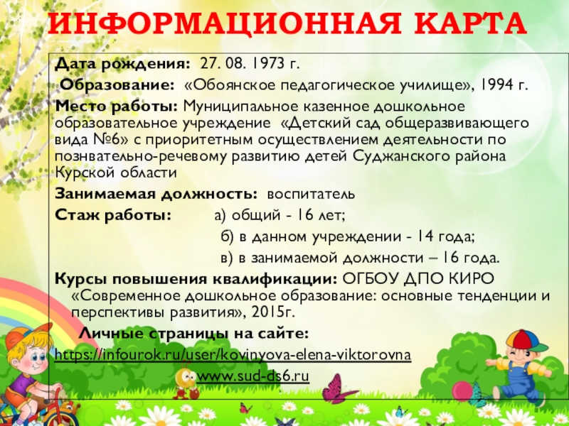 Место работы: Муниципальное казенное дошкольное образовательное учреждение «Детский сад общеразвивающего вида №6» с приоритетным осуществлением деятельности по познвательно-речевому развитию детей Суджанского района Курской области