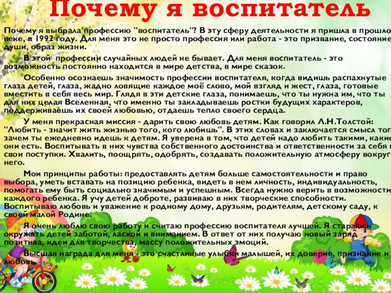 Я очень люблю свою работу и считаю профессию воспитателя лучшей. Я стараюсь окружать детей заботой, лаской и вниманием. В ответ от них получаю новый заряд позитива, идеи для творчества, массу положительных эмоций.