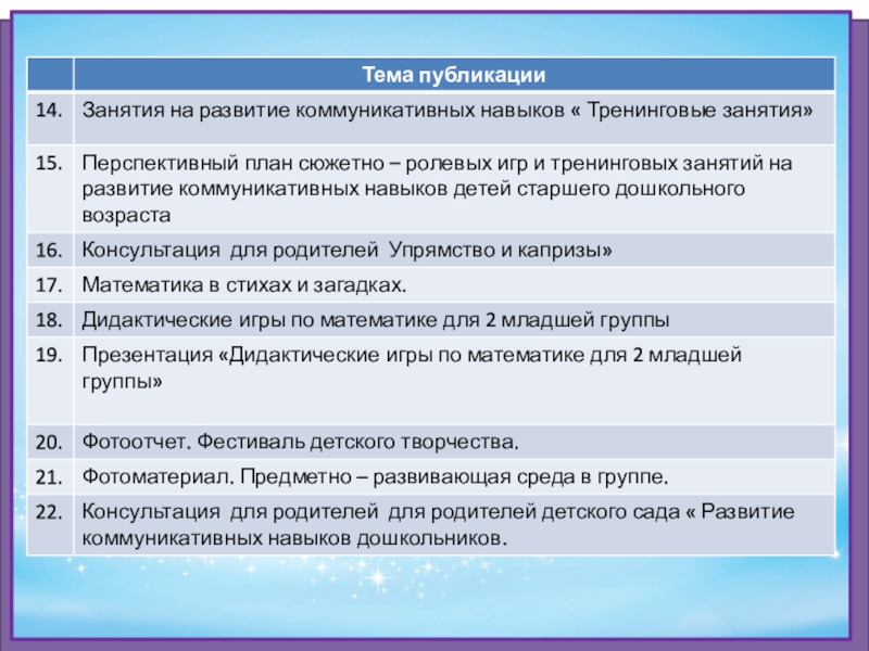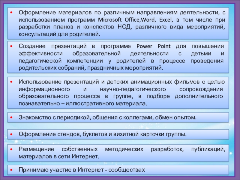 Создание презентаций в программе Power Point для повышения эффективности образовательной деятельности с детьми и педагогической компетенции у родителей в процессе проведения родительских собраний, праздничных мероприятий.