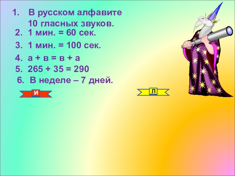 6. В неделе – 7 дней.В русском алфавите   10 гласных звуков.2. 1 мин. = 60