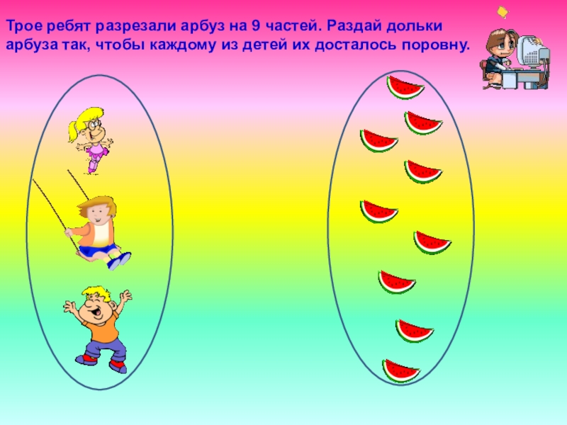 Трое ребят разрезали арбуз на 9 частей. Раздай дольки арбуза так, чтобы каждому из детей их досталось