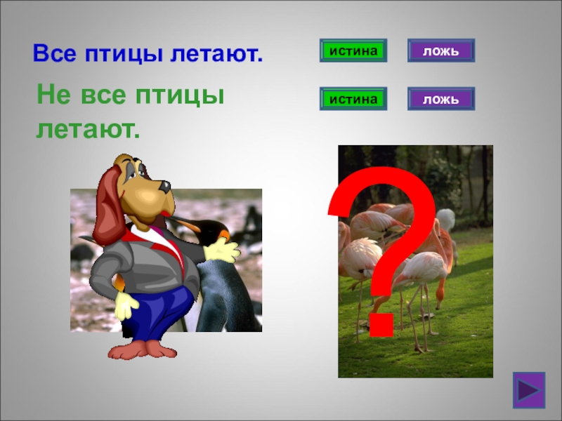Все птицы летают.Не все птицы летают.истинаистиналожьложь?