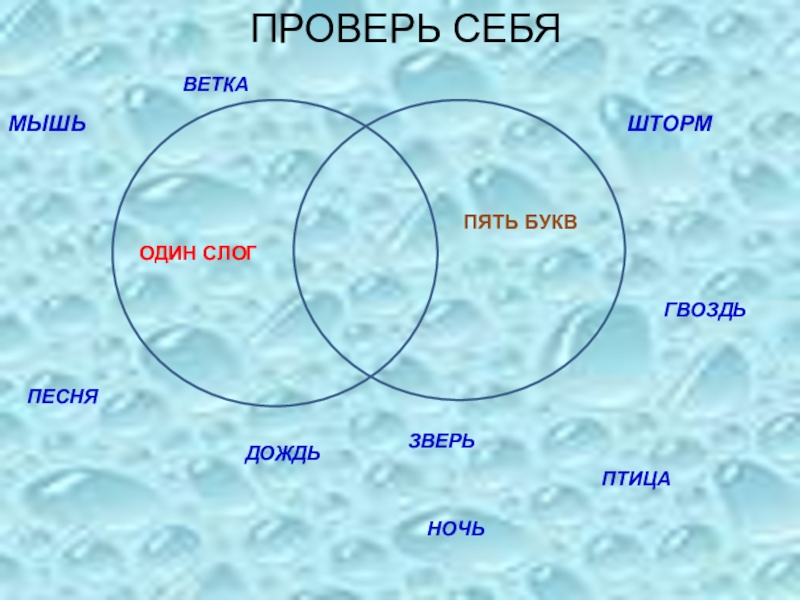 ОДИН СЛОГПЯТЬ БУКВМЫШЬШТОРМ НОЧЬПТИЦАВЕТКАПЕСНЯГВОЗДЬДОЖДЬЗВЕРЬПРОВЕРЬ СЕБЯ