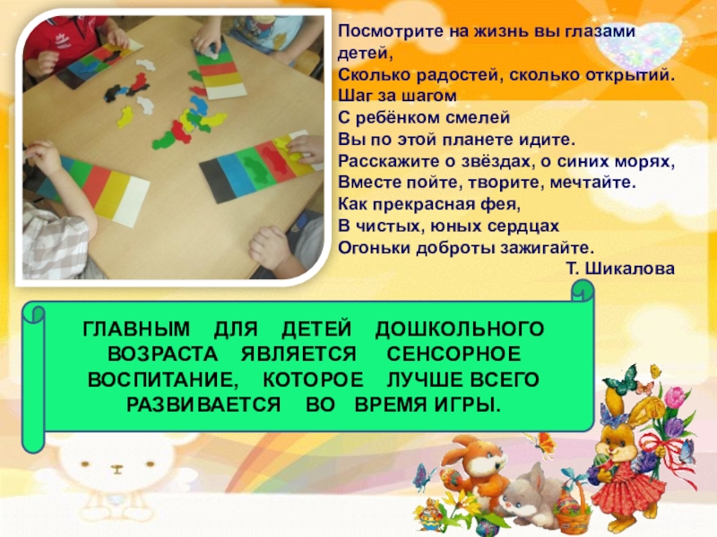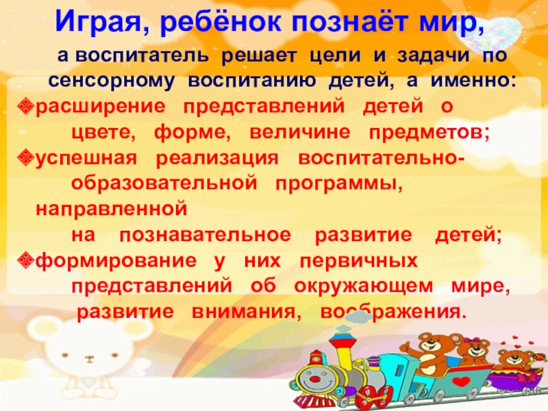 ГЛАВНЫМ ДЛЯ ДЕТЕЙ ДОШКОЛЬНОГО ВОЗРАСТА ЯВЛЯЕТСЯ СЕНСОРНОЕ ВОСПИТАНИЕ, КОТОРОЕ ЛУЧШЕ ВСЕГО РАЗВИВАЕТСЯ ВО ВРЕМЯ ИГРЫ.