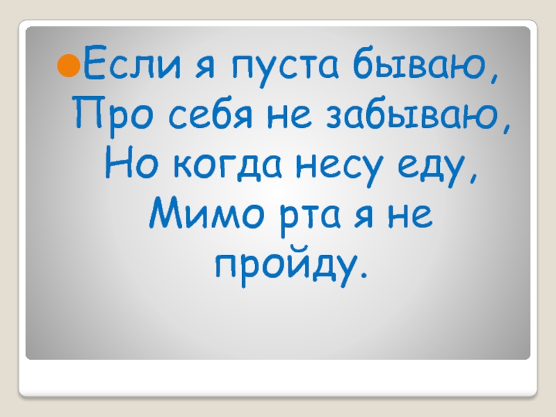 Слайд 20Если я пуста бываю, Про себя не забываю, Но когда несу еду, Мимо рта