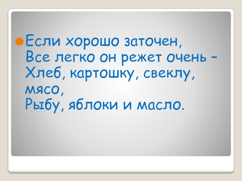 Если хорошо заточен, Все легко он режет очень – Хлеб, картошку, свеклу, мясо, Рыбу, яблоки и масло.