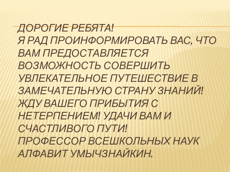 Дорогие ребята! Я рад проинформировать вас, что вам предоставляется возможность совершить увлекательное путешествие в замечательную страну Знаний!