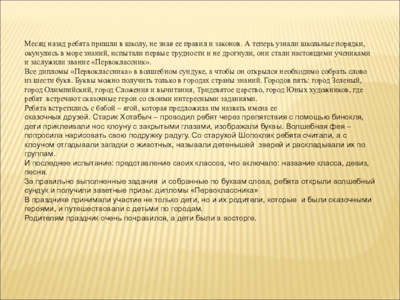 законов. А теперь узнали школьные порядки, окунулись в море знаний, испытали первые трудности и не дрогнули, они стали настоящими учениками и заслужили звание «Первоклассник».