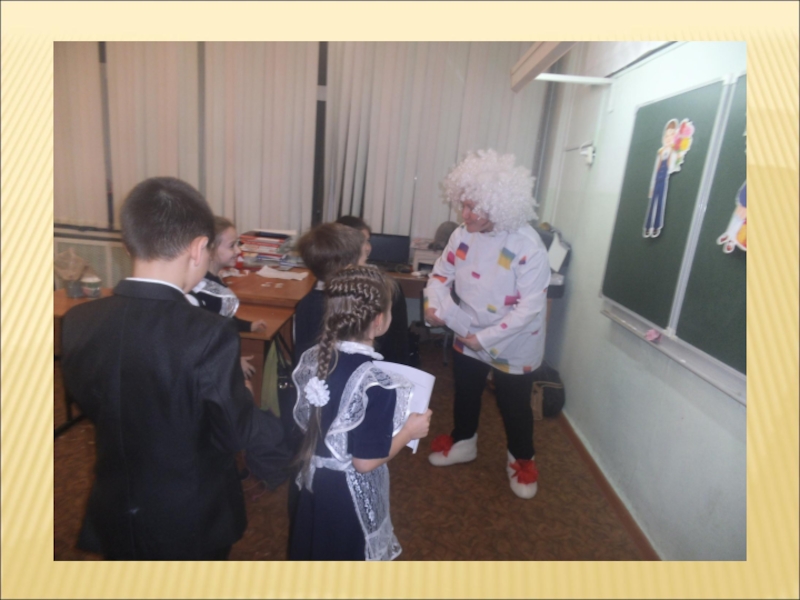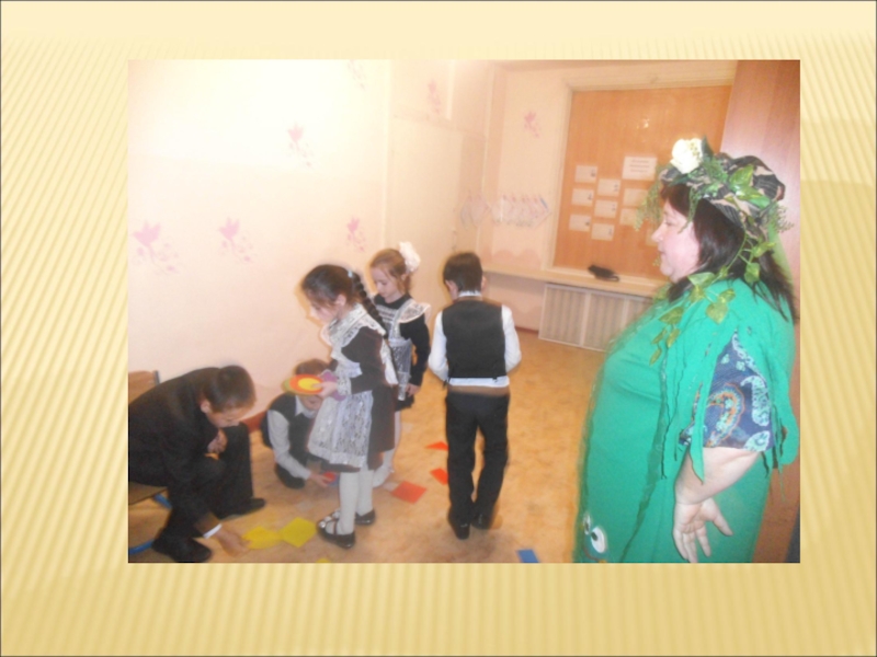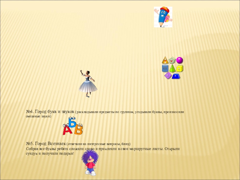 сказочных друзей. Старик Хотабыч – проводил ребят через препятствия с помощью бинокля, дети приклеивали нос клоуну с закрытыми глазами, изображали буквы. Волшебная фея – попросила нарисовать свою подружку радугу. Со старухой Шопокляк ребята считали, а с клоуном отгадывали загадки о животных, называли детенышей зверей и раскладывали их по группам.