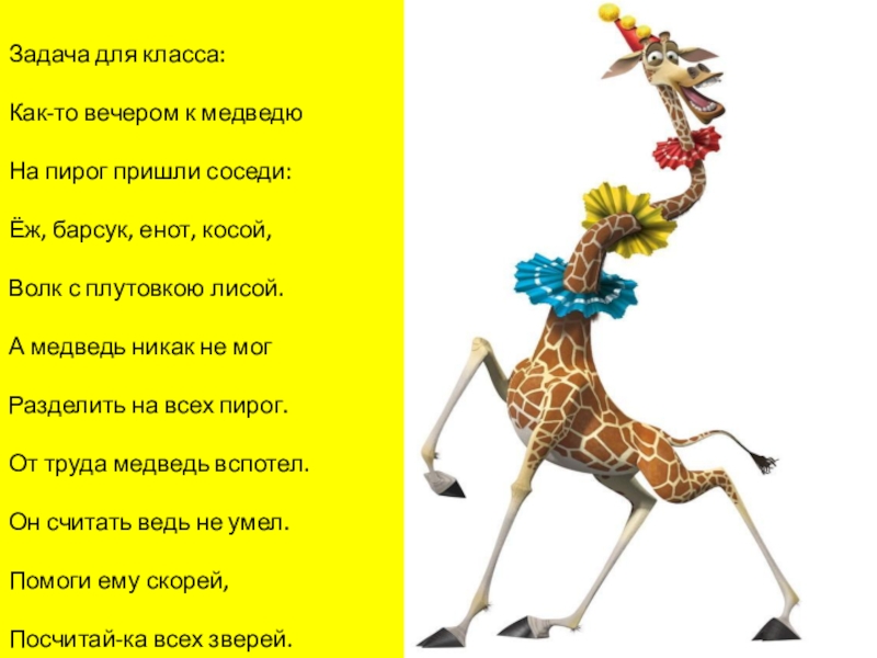 Слайд 19  Задача для класса:   Как-то вечером к медведю   На пирог пришли соседи:   Ёж, барсук, енот,