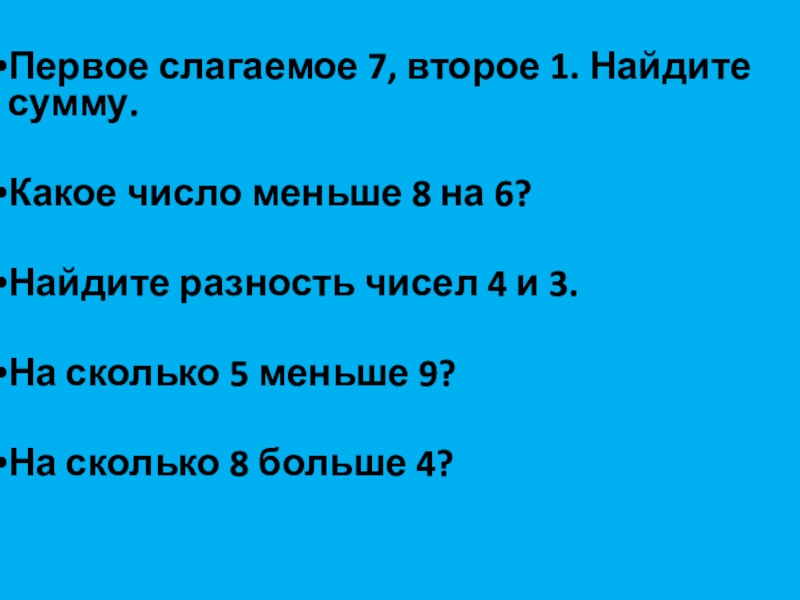 Первое слагаемое 7, второе 1. Найдите      сумму. Какое число меньше 8 на 6? Найдите