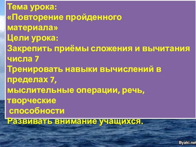 Слайд 2Тема урока: «Повторение пройденного материала» Цели урока: Закрепить приёмы сложения и вычитания числа 7