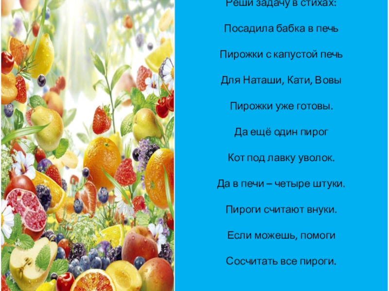 Слайд 18  Реши задачу в стихах:   Посадила бабка в печь   Пирожки с капустой печь   Для Наташи,