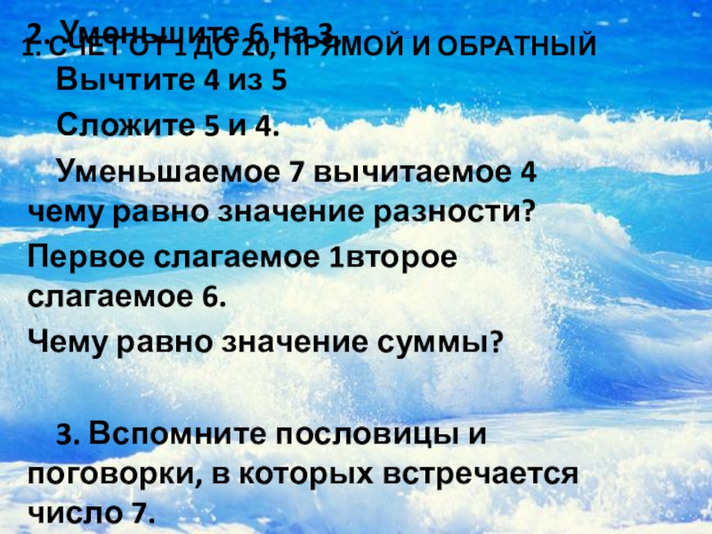 1. СЧЕТ ОТ 1 ДО 20, ПРЯМОЙ И ОБРАТНЫЙ2. Уменьшите 6 на 3,  Вычтите 4 из