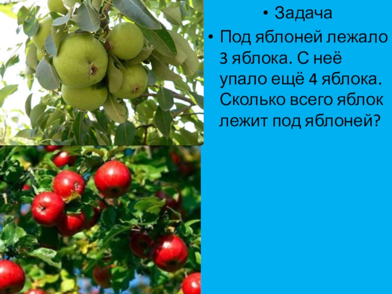 Задача Под яблоней лежало 3 яблока. С неё упало ещё 4 яблока. Сколько всего яблок лежит под