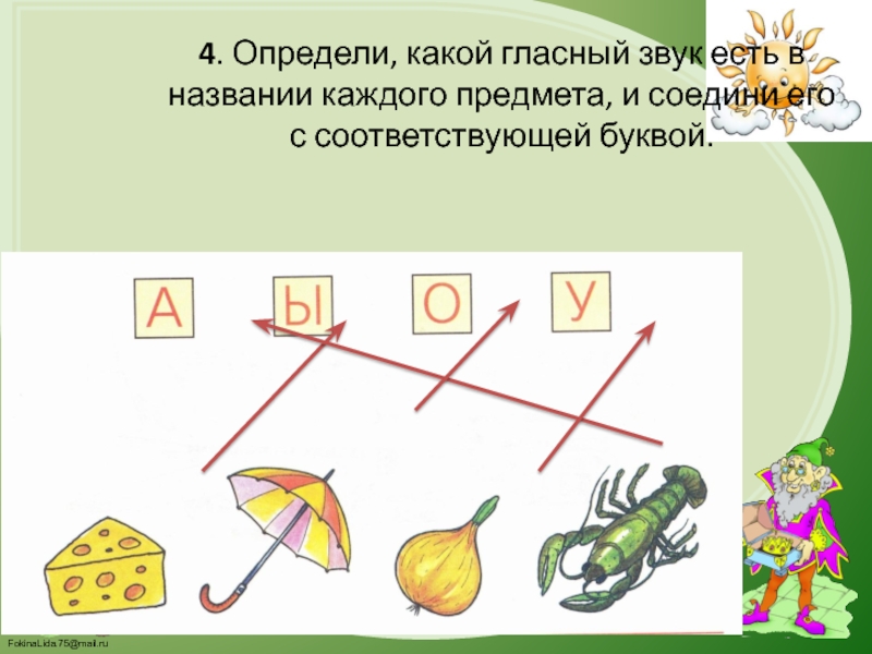 4. Определи, какой гласный звук есть в названии каждого предмета, и соедини его с соответствующей буквой.