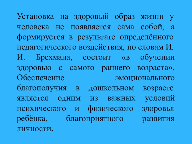 а формируется в результате определённого педагогического воздействия, по словам И. И. Брехмана, состоит «в обучении здоровью с самого раннего возраста». Обеспечение эмоционального благополучия в дошкольном возрасте является одним из важных условий психического и физического здоровья ребёнка, благоприятного развития личности.