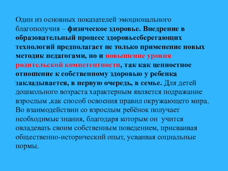 Слайд 4Один из основных показателей эмоционального благополучия – физическое здоровье. Внедрение в
