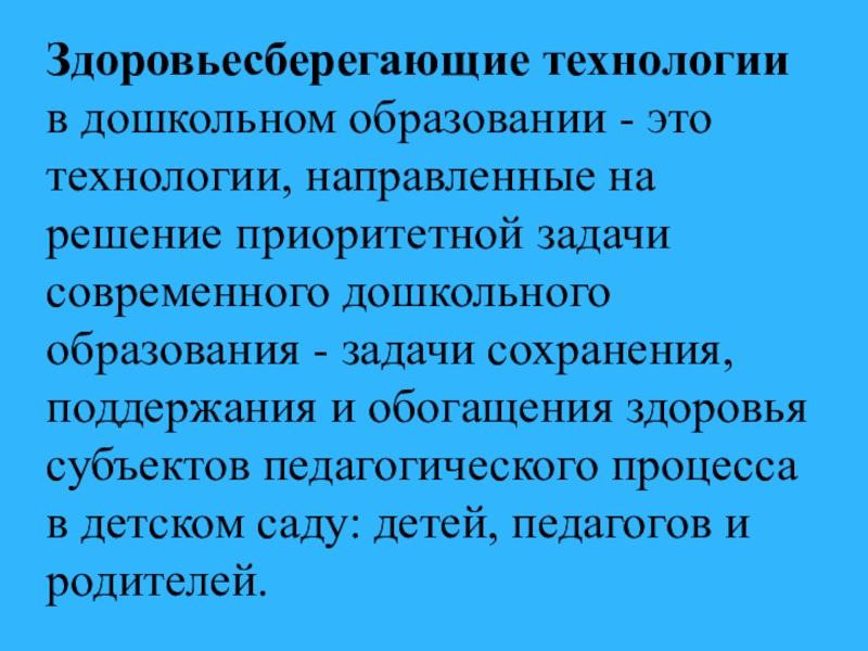 приоритетной задачи современного дошкольного образования - задачи сохранения, поддержания и обогащения здоровья субъектов педагогического процесса в детском саду: детей, педагогов и родителей.